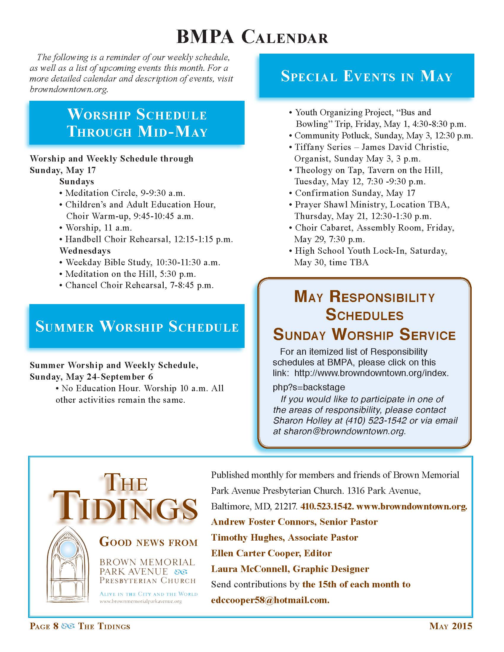 Newsletters This is a recent issue of the monthly newsletter for Brown Memorial Park Avenue Presbyterian Church in Baltimore, MD. I took over the design and layout of it in 2008 and turned it over to the Communications Manager of the church in Summer 2015. Share this:Share Click to share on Facebook (Opens in new window) Facebook Click to share on X (Opens in new window) X Click to email a link to a friend (Opens in new window) Email Like Loading...